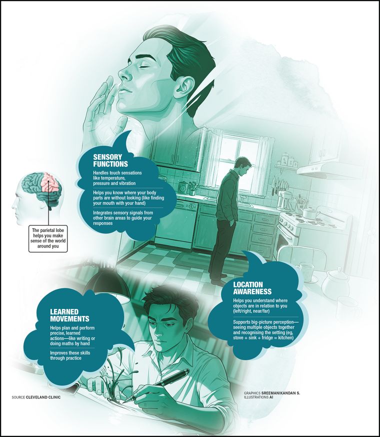 If the frontal lobe is where we decide what to do, the parietal lobe is where we understand where we are. It is the brain’s internal GPS, the quiet navigator that lets you put your hand exactly where your teacup is, find the edge of a staircase without staring at it, or scratch the correct side of your head when it itches. When it works well, we move through life gracefully. When it falters, life becomes slapstick comedy.