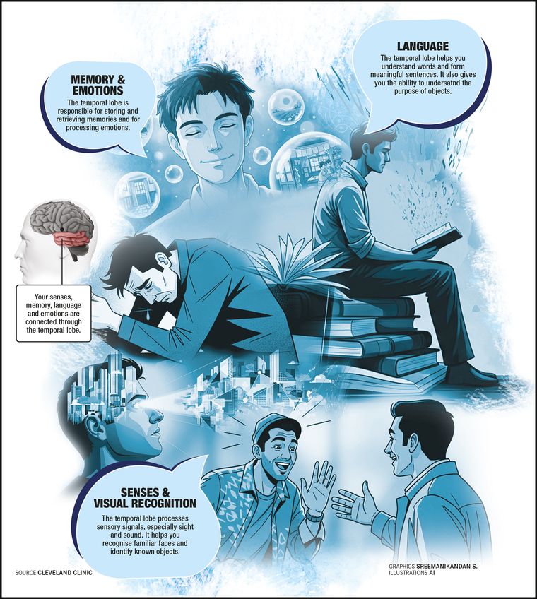 The temporal lobe is the part of the brain that stores music—not just the lyrics, but the emotional signatures glued to them. It is why you can forget a birthday but remember every word of an old Kishore Kumar classic. It is the lobe that hums even when you don’t. It holds memory, language, rhythm, fear, nostalgia, and the entire soundtrack of your teenage years. If the frontal lobe is the editor and the parietal lobe the director, the temporal lobe is the DJ.
