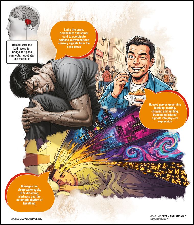The pons is the diplomat of the brainstem. It connects, negotiates and mediates. Anatomically named after the Latin word for bridge, it does exactly that—it links the brain to the body, movement to expression, wakefulness to sleep. If the midbrain watches, the pons communicates.