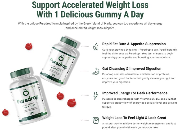 Puradrop is a gummy supplement that is intended to provide several health advantages, such as increased energy, quick fat burning, healthy weight loss, and boosted metabolism.