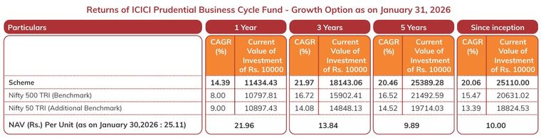 Mumbai, February 11, 2026: ICICI Prudential Business Cycle Fund (the Scheme), an open ended equity scheme following a business-cycle-based investing theme, has completed five years since inception, marked by consistent performance across varying market conditions.