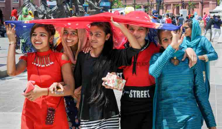 Young women use a drape to protect themselves from scorching heat on a hot, summer day as temperature soars, in Amritsar | PTI