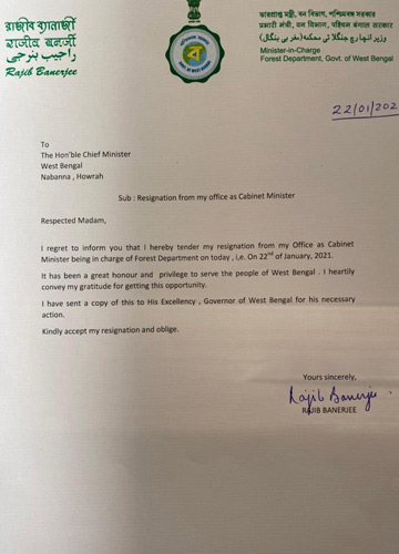 “I regret to inform you that I hereby tender my resignation from my Office as Cabinet Minsiter being in charge of Forest Department on today, i.e., On 22nd of January, 2021,” he wrote in the letter.