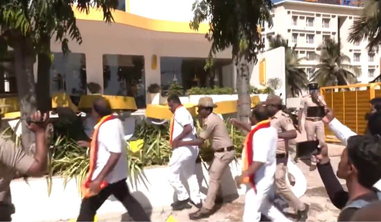 Pro-Kannada outfits in Bengaluru vandalised English signages at shops and business establishments in the city on Wednesday days after a new order issued by the civic authority.