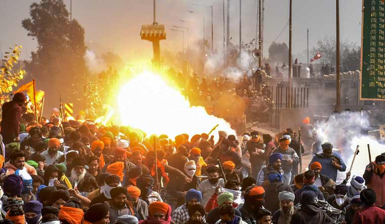 A tear gas explodes after being fired upon the protesting farmers during their 'Delhi Chalo' march, near the Punjab-Haryana Shambhu Border, in Patiala district | PTI