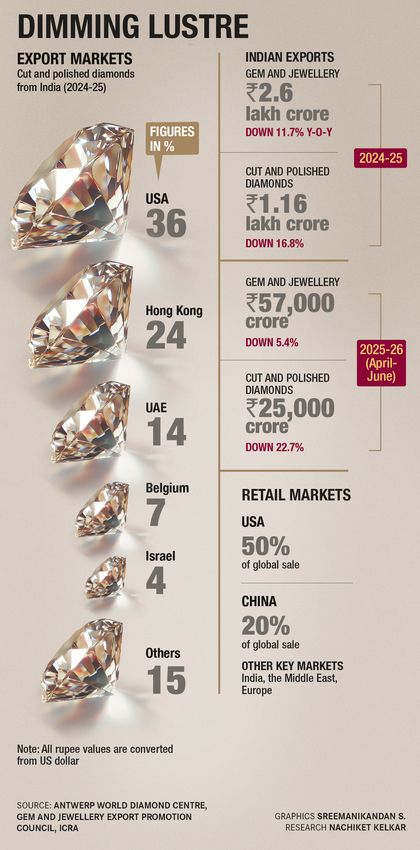 Adding to the woes, the US government has imposed 50 per cent tariffs on certain Indian imports, a move that threatens to hit the diamond industry even harder.