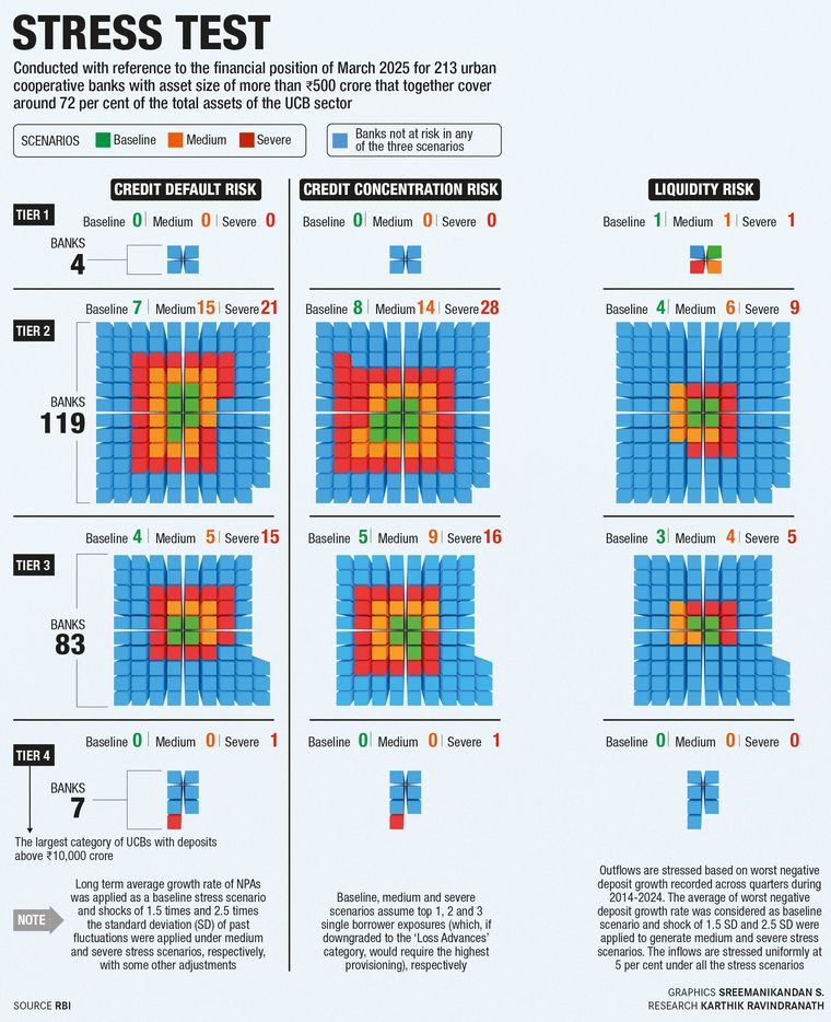 Stress tests were conducted on 213 UCBs with assets size of more than Rs500 crore to assess credit risk, interest rate risk and liquidity risk based on their financial positions as of March 2025. It was found that one bank in Tier 4 (the largest category of UCBs with deposits above Rs10,000 crore) would not be able to meet minimum regulatory requirement of 11 per cent CRAR under severe stress for credit default risk and for credit concentration risk. But, for Tier 2 and Tier 3 UCBs, the impact of credit risk and credit concentration risk under severe stress would be significant.