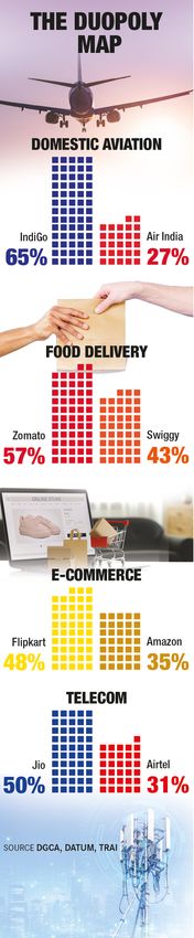 The situation is worse in the digital economy, where one or two dominant players straddle the ecosystem. In e-commerce, Flipkart and Amazon hold a major chunk of the market. In food delivery, Zomato holds about 58 per cent of the market, and Swiggy, virtually the only other player in the scene, controls most of the rest.