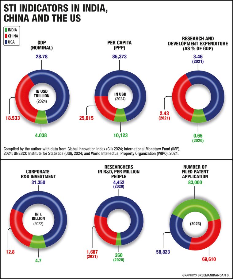 China is an upper middle income country and India is a lower middle income country. Being neighbours and starting their independent growth journeys simultaneously, they often prompt comparison between them. To forecast the future growth trajectory and global power trends involving these two countries, the science, technology and innovation (STI) indicators serve as a global framework for measurement, analysis, comparison, technological intelligence and strategic statistical data. The chief components of these indicators include research and development endeavours and innovation systems.