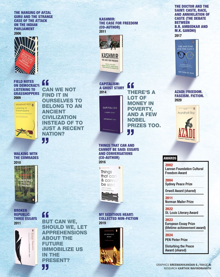 And then came the final act in her life of waning anonymity—a book that at once set her free and shattered her freedom: The God of Small Things. It was published in 1997, when Arundhati was 36 years old. For a while after it won the Booker Prize, she was the blue-eyed girl of India. It was a role she loathed, so much so that when she published her first political essay, The End of Imagination, on the ramifications of India detonating three nuclear devices in Pokhran, the reaction to it—which was almost as explosive as the bombs themselves—came as a relief. “It liberated me and set me walking,” she writes. “For years after that I wandered through forests and river valleys, villages and border towns, to try to better understand my country. As I travelled, I wrote. That was the beginning of my restless, unruly life as a seditious, traitor-writer. Free woman. Free writing. Like Mother Mary taught me.”