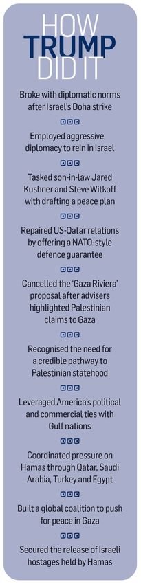 During a heated phone call with Netanyahu, Trump accused him of endangering a crucial diplomatic effort and called the attack “unacceptable”. Until then, he had largely permitted Israel to continue its military operations against Hamas, in line with his strong political alignment with Netanyahu. But after the Doha incident, Trump reversed course and decided to use the force of his personality and the unmatched power of his office to get what he wanted. He flew to the Middle East on October 13, shrugging off the disappointment of not winning the Nobel prize, and signed a deal to end the Gaza war, at least for the time being.