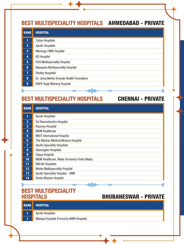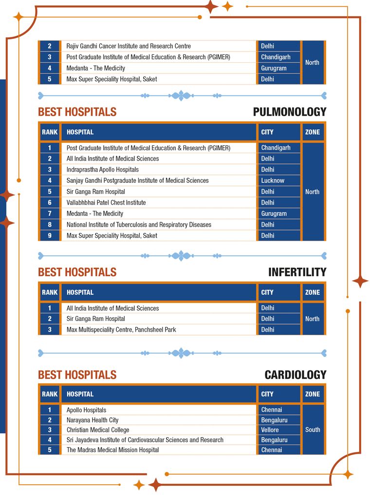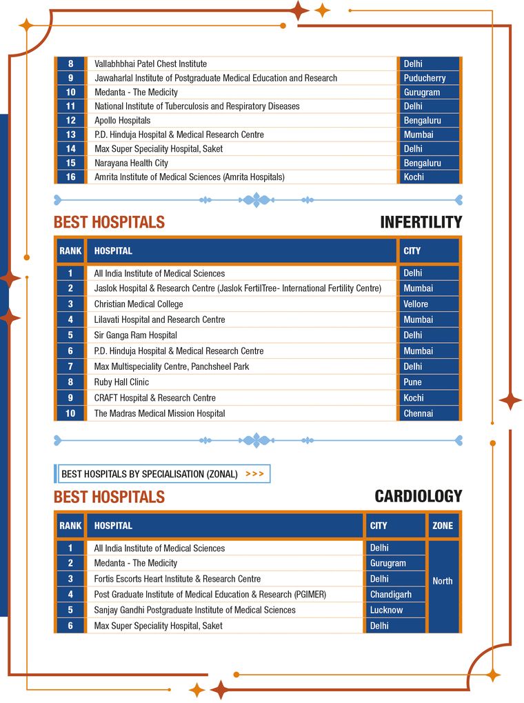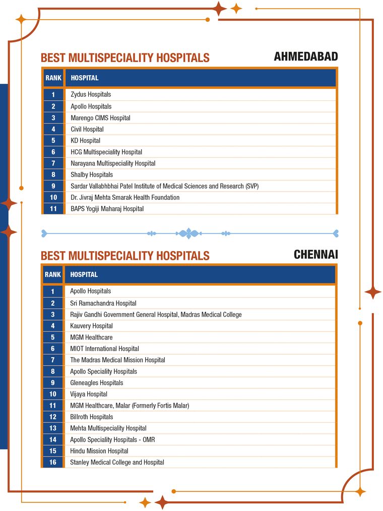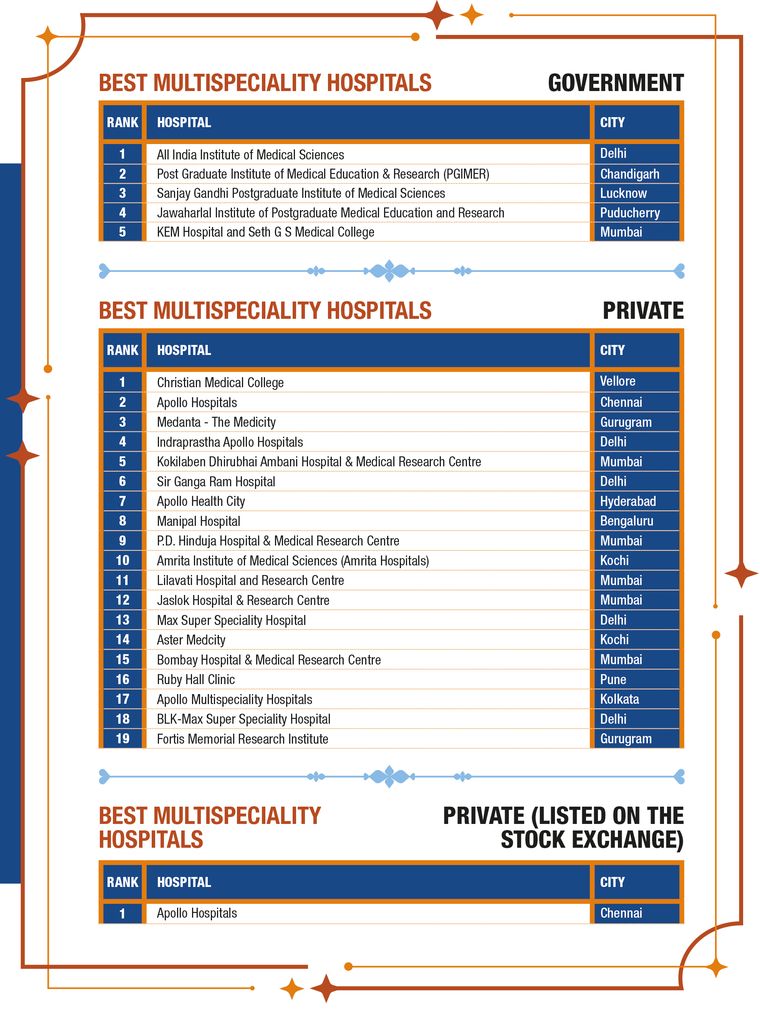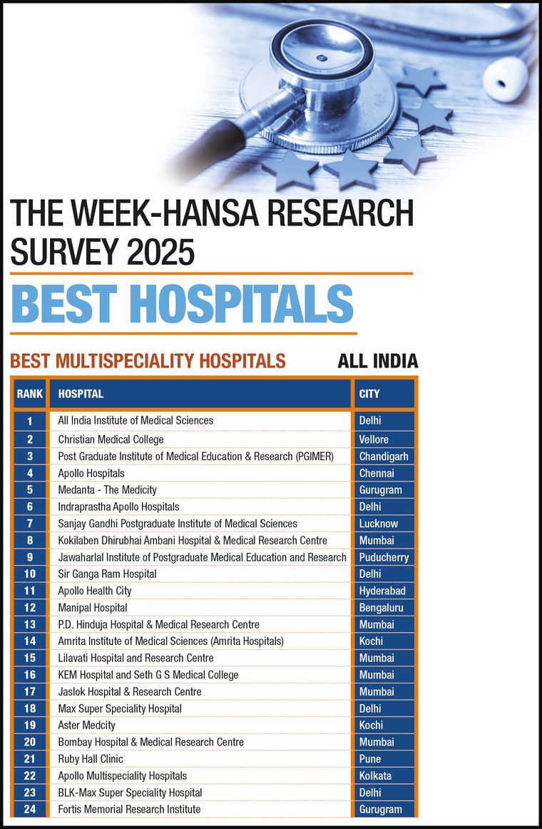 The survey covered 19 cities (plus the National Capital Region) that are important medical centres. Top hospitals for 10 specialisations were also ranked.