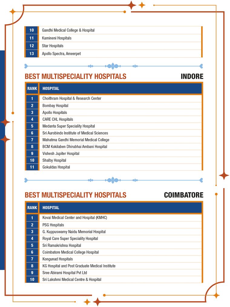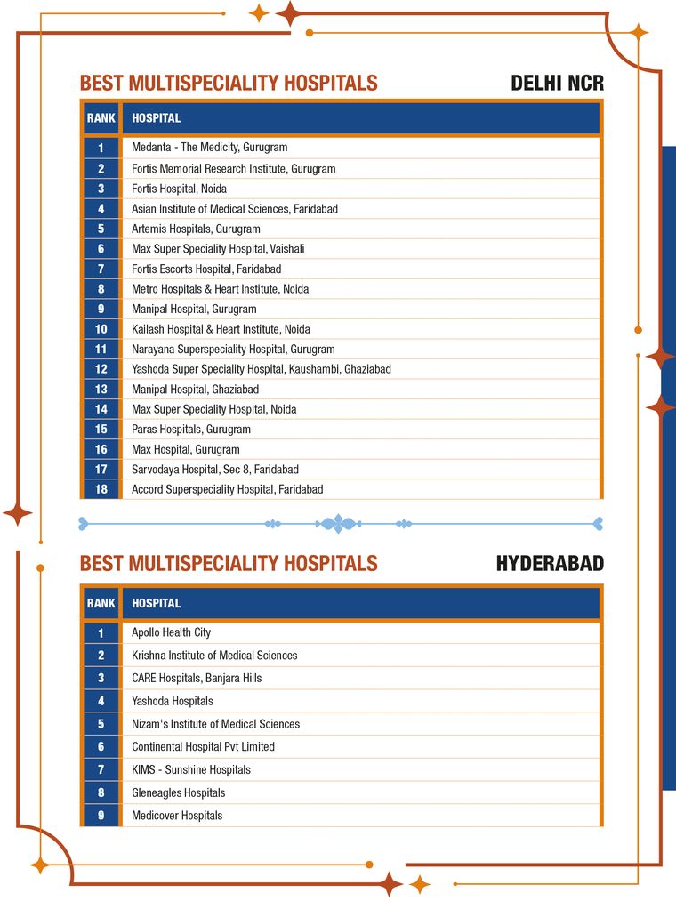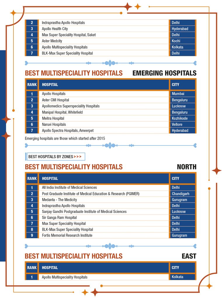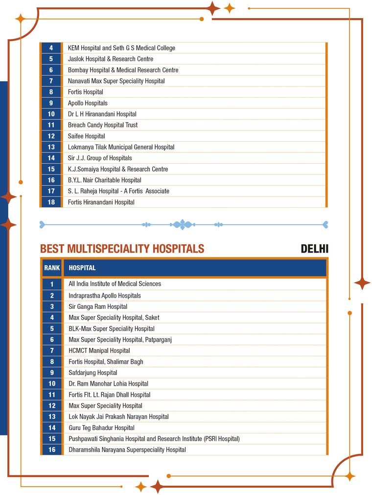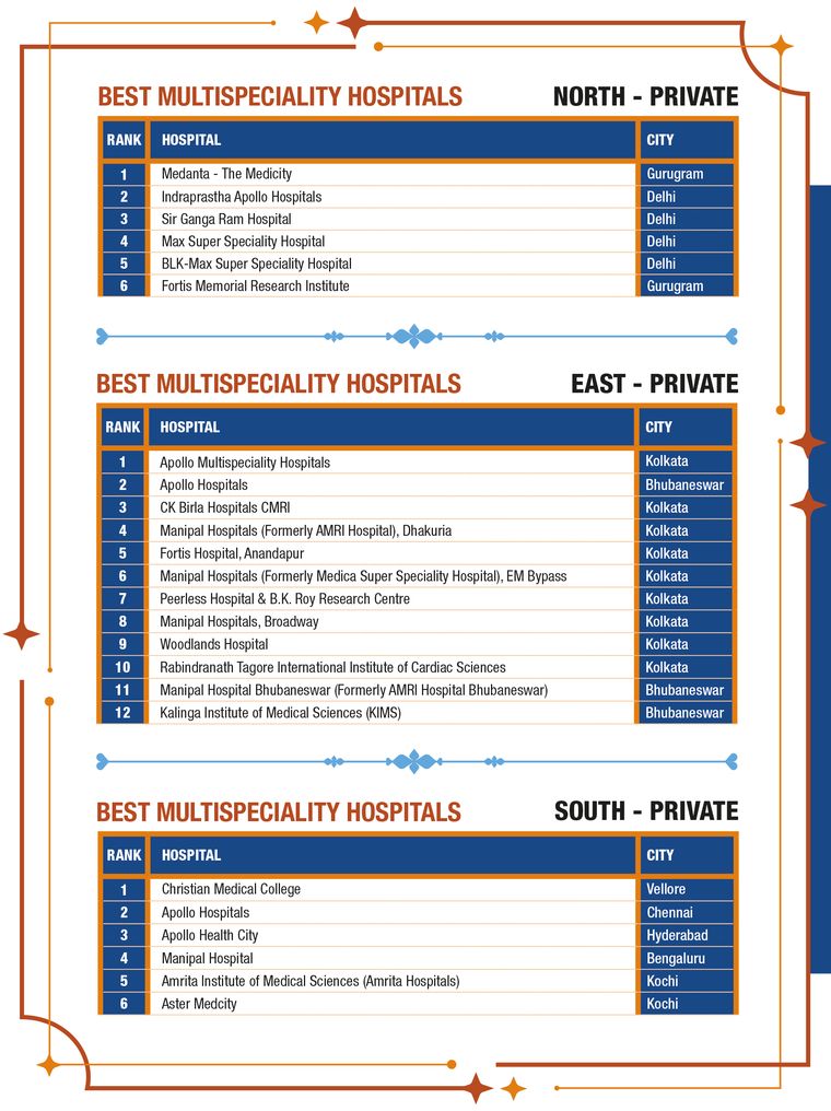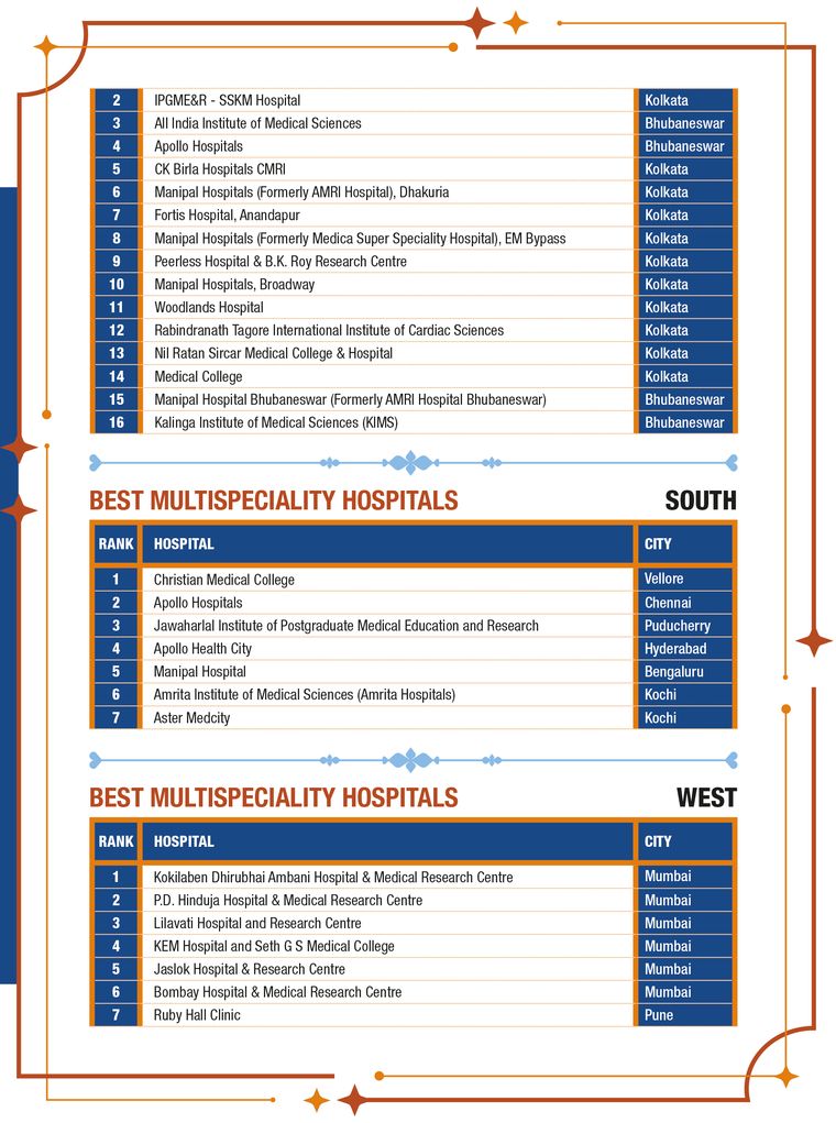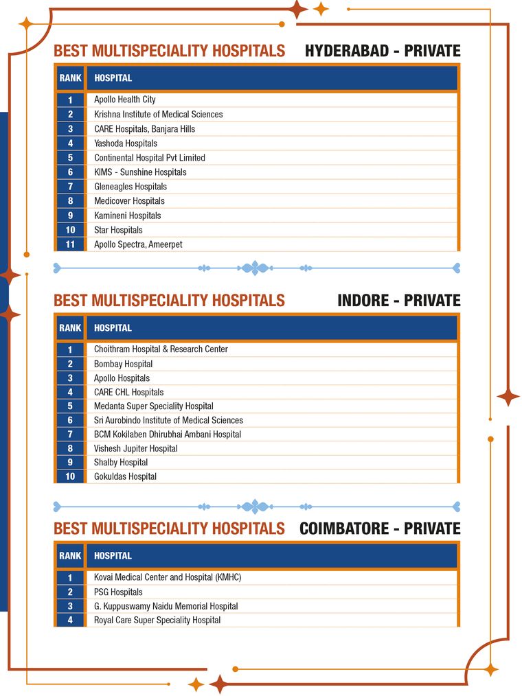 The survey covered 19 cities (plus the National Capital Region) that are important medical centres. Top hospitals for 10 specialisations were also ranked.