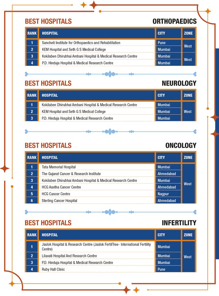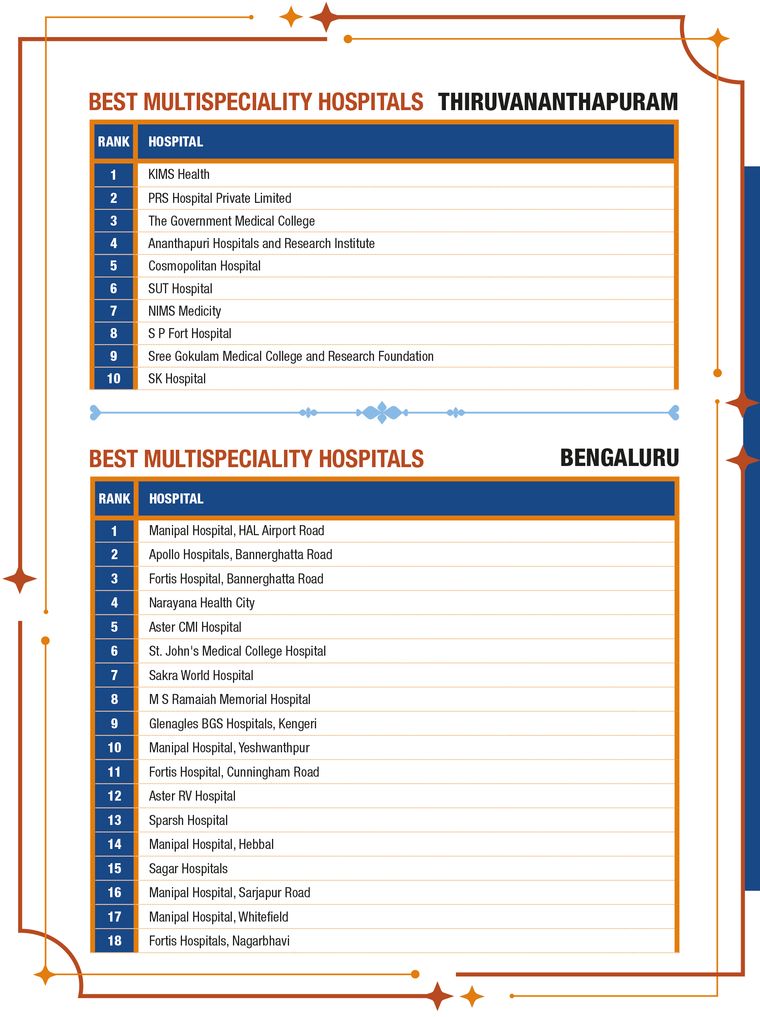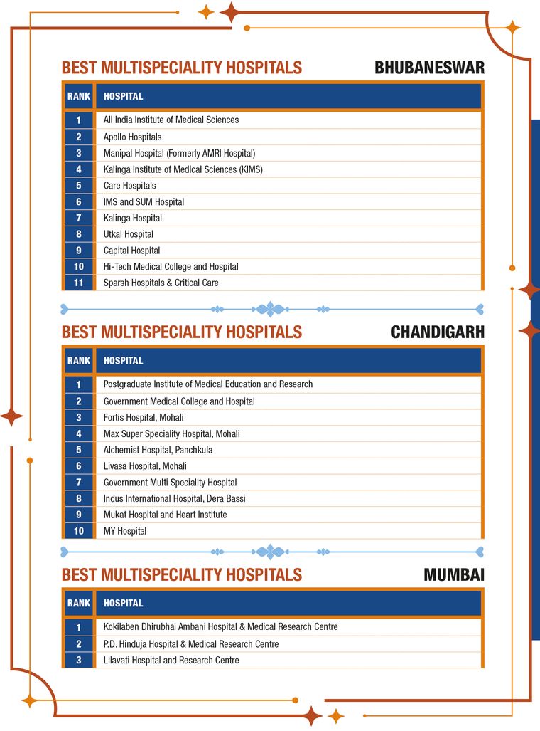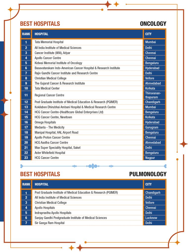 Data collected from the survey was validated using factual data from hospitals and other secondary sources. The final list was validated by leading doctors. Specialisation rankings were validated by experts who are opinion leaders in their field. City rankings were validated by experts from respective cities.