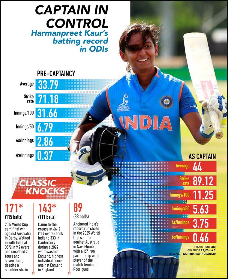 In a career defined by big moments, it is often the small ones that have shaped Harman the most, especially some conversations with coaches. W.V. Raman, former head coach, remembers her as being “highly intense” in the early days of his stint. “I took charge of the team in 2019, and, gradually, as she gained experience and the nucleus of the team started forming, she became calm both as a batter and a captain,” he says. “This has benefited her and, as an extension, the team as well.”