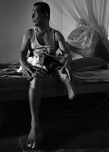 He has not given up. With his artificial leg, the 73-year-old pedals his bicycle to his plantain farm. He needs a new prosthetic leg, as the current one no longer fits because of age. “Every landmine victim is entitled to a pension of 10,000 rupees,” he said. “But, I have not received it.” He lives in a house built under the Indian Housing Project.