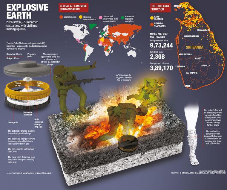 Sri Lanka looks like a droplet frozen in time. That very shape is a haunting reminder of the tears shed during decades of civil war. The emblem of the Liberation Tigers of Tamil Eelam, which waged the war, was a tiger baring its teeth and claws, but the territory once claimed by it—the northern and eastern provinces—resembles a raptor’s claw clutching the island. When the war ended in 2009, the raptor’s claw had around 15 lakh landmines and unexploded ordnance (UXO), making Sri Lanka one of the most heavily mined countries in the world.