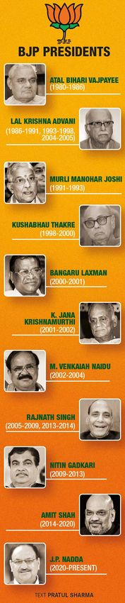 Interestingly, except the 1998-2004 period―Atal Bihari Vajpayee’s tenure as prime minister―when the party had four presidents, all presidents were in their 50s when they first took charge. During that Vajpayee regime, three of the four party presidents were from the south―Bangaru Laxman (61), K. Jana Krishnamurthi (73) and M. Venkaiah Naidu (63). This was a time when the BJP organisation suffered because of Vajpayee’s focus on governance. Moreover, Laxman, who was also the party’s first dalit president, had to step down in 2001, after a sting operation by a news magazine showed him accepting a bribe.