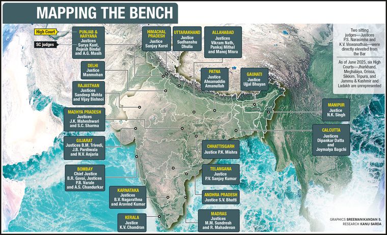 As of June 2025, the High Courts of Jharkhand, Meghalaya, Orissa, Sikkim and Tripura, and the High Court of Jammu and Kashmir and Ladakh have had no judges elevated to the Supreme Court since 2018, raising questions about the collegium’s approach to appointments and whether such practices are fair and diverse.