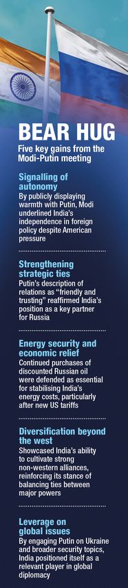 Talk of reviving the old Russia–India–China (RIC) framework surfaced yet again at the summit. Russia now champions its revival, buoyed by the promise of the Eurasian clout: together, RIC’s GDP stands at nearly $54 trillion, with $5 trillion in exports and 38 per cent of humanity under its demographic umbrella. Moscow, increasingly isolated by the west, finds it convenient to pitch RIC as an alternative platform where it can remain relevant. Beijing, too, likes the idea of a trilateral that can project anti-western optics, especially when its own global image is under stress. But nostalgia does not substitute strategy. The RIC experiment faltered in the past for reasons that have not gone away: mismatched power equations, conflicting ambitions and India’s unresolved boundary dispute with China. To believe that RIC can become a strategic triangle in the present climate is more diplomatic theatre than political reality.