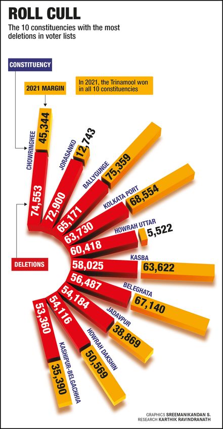 The geography of deletion is also revealing. Murshidabad—a border district with a complex migration history and significant minority population—has over 4.5 lakh invalid voters and the highest volume of complaints. North 24 Parganas and South 24 Parganas record 3.25 lakh and 2.22 lakh, respectively. Purba Bardhaman has 2 lakh-plus removed. In Nadia, nearly 78 per cent of adjudicated cases have been rejected—the highest proportional purge in the state. In Cooch Behar, invalidation rates exceed 45 per cent. These clusters overlap with regions marked by demographic complexity, minority populations, migrant communities and economically vulnerable groups.