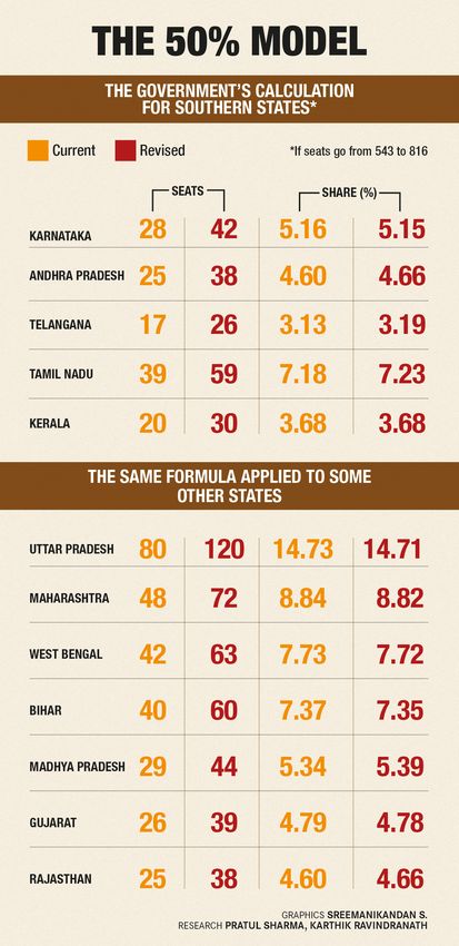 Three years later, it was déjà vu. The government called a three-day special session less than two weeks after the budget session, and presented three new bills. This time, there was no secrecy—it was the same cause. However, the plan was to use 2011 census data instead of waiting for the completion of the ongoing census, and to expand the Lok Sabha from 543 to 850 seats after delimitation. Under the proposed formula, the government had offered to increase the number of seats in all states and Union territories by 50 per cent, bypassing the existing population-based formula. This would keep the overall share of each state the same, thus preserving their political heft.