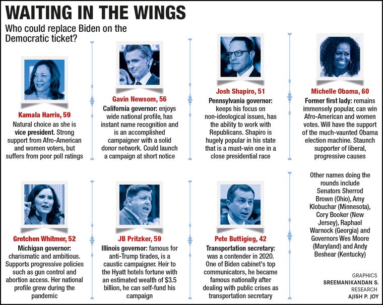 So who are the possibilities? Vice President Kamala Harris has, at times, struggled to define her role at Biden’s side, and is regarded somewhat of a political liability. There are a handful of other good contenders, including governors Newsom of California, Gretchen Whitmer of Michigan, J.B. Pritzker of Illinois and Josh Shapiro of Pennsylvania. Other possibilities include Transportation Secretary Pete Buttigieg and Senators Cory Booker of New Jersey and Amy Klobuchar of Minnesota. There were also reports about former first lady Michelle Obama as a candidate, but after Biden’s debate disaster, Barack Obama issued a forceful statement supporting the president.