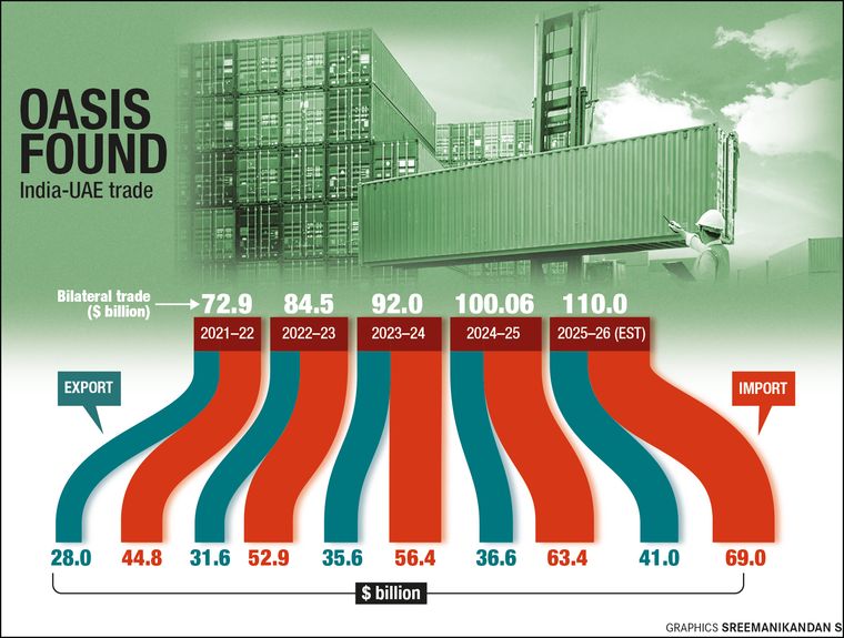 CEPA’s early results have been encouraging. Bilateral trade has grown by 37 per cent since 2022–23, prompting leaders to set an ambitious target of $200 billion by 2032. With India’s exports to the UAE rising 28 per cent last year to $36 billion and imports increasing 41 per cent to $64 billion, the target appears achievable. At a time when unilateral tariffs by the United States threaten to dampen export growth, deeper engagement with reliable partners like the UAE provides a valuable buffer. Beyond numbers, CEPA has strengthened trust between businesses and investors, generating positive spillovers in investment and supply-chain integration.