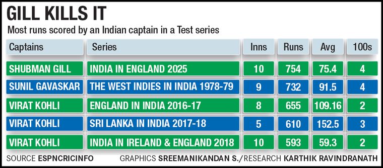 Though he had a modest overseas record, and was in his first series as captain, Gill quelled concerns of how he would handle the twin responsibility. He scored 754 sublime runs with four centuries; only Don Bradman, with 810, has more as captain in a series.