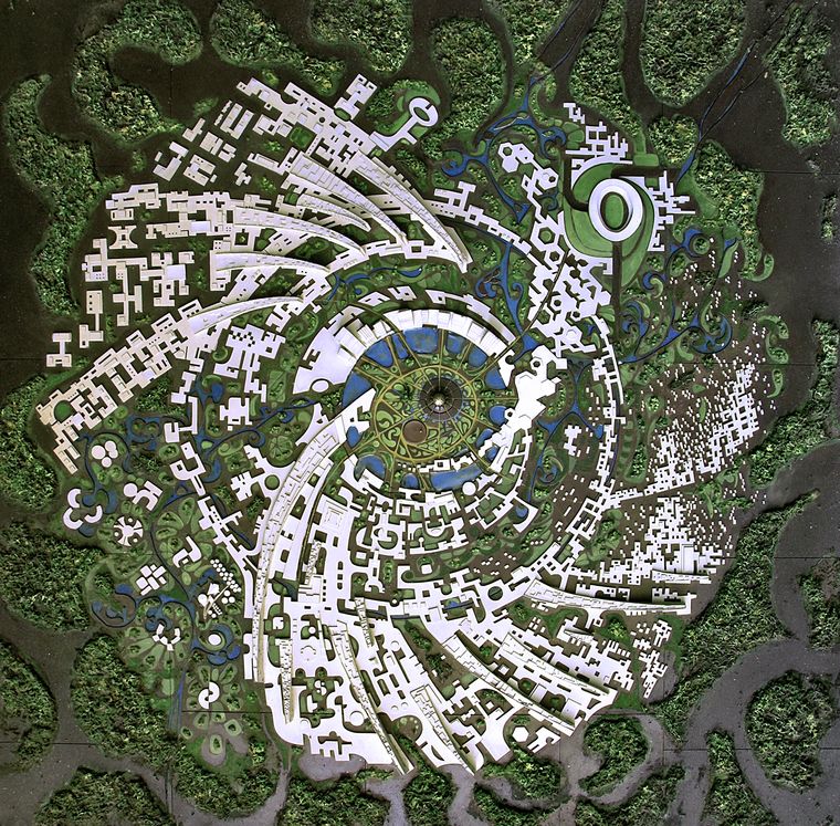 Auroville’s master plan resembles the form of a galaxy with several arms extending from a central region. The form was envisioned by the Mother herself. At the centre is the Matri Mandir, and radiating outward from it are four zones, each focusing on an important aspect of the township’s life—industrial, cultural, residential and international. The surrounding township is a green belt consisting of forested areas, farms and sanctuaries with scattered settlements.